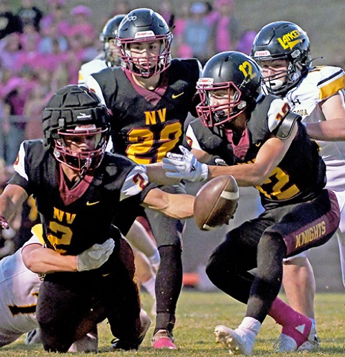 North Valley's Hayden Taylor (2) stretches toward the end zone but misses breaking the plane of the goal line by 1 yard on fourth-and-goal as the Knights come up just short on a scoring drive in the first quarter against South Umpqua on Friday night in Merlin. North Valley won the game 6-3.