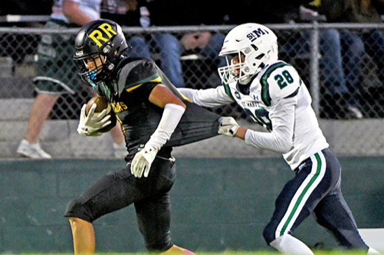 Rogue River's Mason Scott (left) tries to break free from the grasp of Hudson Eiler (28) of St. Mary's after making a catch during the first quarter on Friday night at Chieftain Stadium. The Chieftains defeated the Crusaders 65-42.