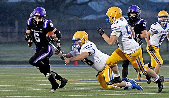 Cascade Christian receiver Caleb Scaglione (6) breaks away from Gervais defenders in the first quarter of their Class 3A state semifinal playoff game Saturday at Cottage Grove High School. The Challengers won 36-0.