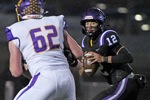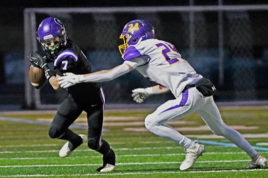 Cascade Christian wide receiver Hutton Walker (7) tries to shake Burns defensive back Preston Hill during the Class 3A football state championship game Saturday night at Summit High School in Bend. The Challengers defeated the Hilanders 35-28 to polish off a perfect 14-0 season and win the state title.
