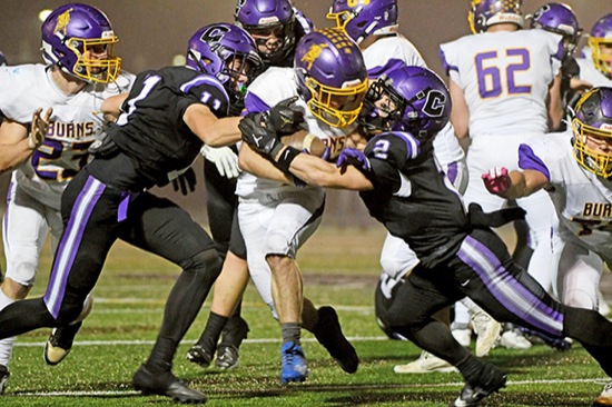 Cascade Christian's Seth Scaglione (11) and Bryson Walker (2) converge on Burns running back Tommy Winn to drag him down during the Class 3A football state championship game Saturday night at Summit High School in Bend. The Challengers defeated the Hilanders 35-28.