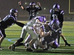 Cascade Christian quarterback Deryk Farmer (center) celebrates with teammates after the Challengers defeated Burns 35-28 to win the Class 3A football state championship game Saturday night at Summit High School in Bend.