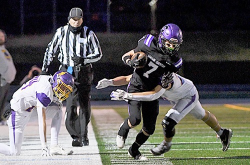 Cascade Christian wide receiver Hutton Walker (7) tries to break free from a Burns defender during the Class 3A football state championship game Saturday night at Summit High School in Bend. The Challengers defeated the Hilanders 35-28 to polish off a perfect 13-0 season and win the state title.