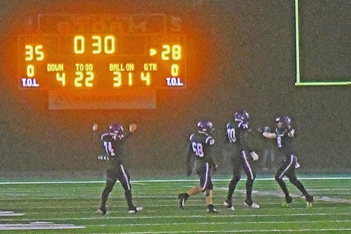 From left, Tucker Mayben, Joey Minard, Blake Patereau and Mikey Covey celebrate during the final minute of the Challengers' victory over Burns in the Class 3A football state championship game Saturday evening at Summit High School in Bend.