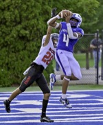 GP #4 makes this leaping catch for GP's first TD in the first quarter. NS #28 defends Grants Pass wins over North Salem, 56-42. Photos By:Joel Takarsh