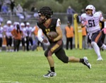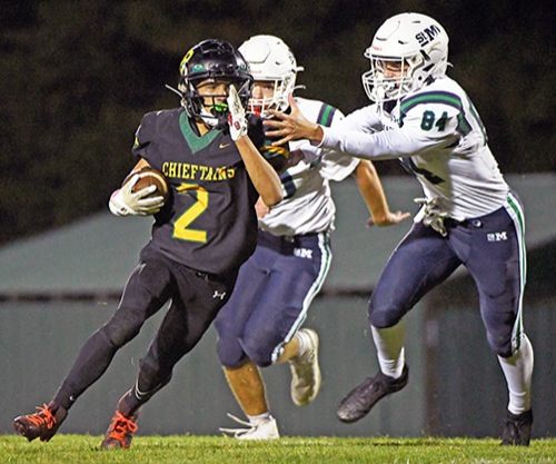 Rogue River's Gianni Gervasi (2) eludes Sam Soter (84) of St. Mary's on his way to a long touchdown run in the first quarter, Gervasi's second TD of the period, on Friday night at Chieftain Stadium. The Chieftains defeated the Crusaders 65-42.