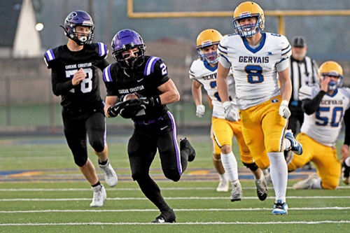 Cascade Christian running back Bryson Walker (2) breaks loose for a 44-yard touchdown on the first drive of the game against Gervais in their Class 3A state semifinal playoff game Saturday at Cottage Grove High School. The Challengers won 36-0.