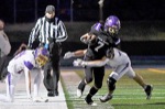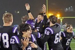 Cascade Christian's Alex Fiannaca (left) and Seth Scaglione (11) celebrate after Fiannaca scored a touchdown on a 20-yard pass from Deryk Farmer with 4:38 left in the third quarter during the Class 3A football state championship game on Saturday night at Summit High School in Bend. The Challengers defeated Burns 35-28 to win the state title and Fiannaca was named the Challengers' player of the game.