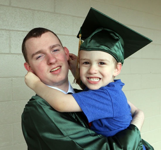 Rogue River High School graduate Cody Pruett shared his mortarboard with his little brother Hunter Jones, 4, and got his ears tweaked for the gesture after the ceremony Saturday.