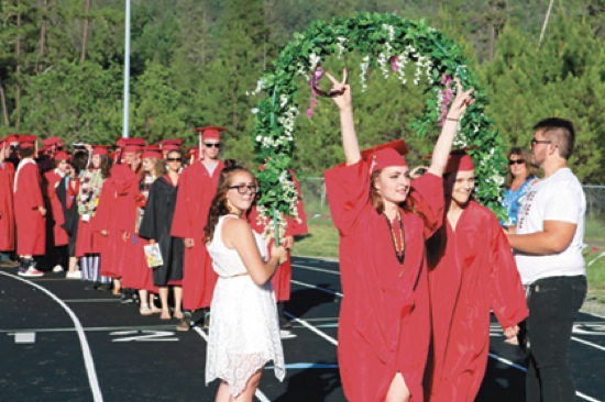 Samantha Cooper, accompanied by her friend Kaylee Dougherty, throws up peace signs following a rowdy round of applause from the crowd at Illinois Valley High School's 2019 graduation.