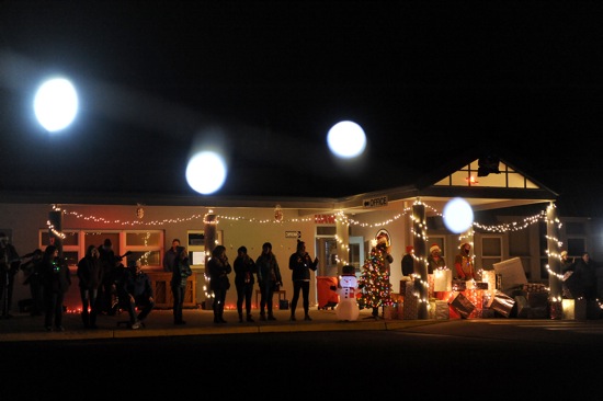 BEA AHBECK/Daily Courier Teachers are lined up to greet students during the 2nd annual GP Express at Highland Elementary in Grants Pass Thurs. Dec. 16, 2021.