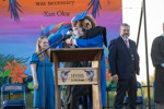 The flag of Japan hangs from a raised basketball goal inside Heater-Newman Memorial Gymnasium during a welcome ceremony honoring the Keisei High School band at Grants Pass High School.
