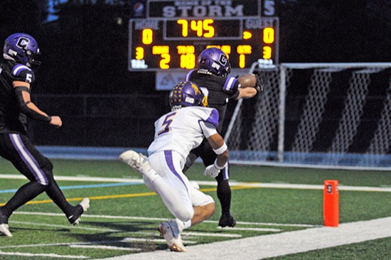 Cascade Christian's Bryson Walker finishes off a 43-yard interception return for a touchdown less than 5 minutes into the game, giving the Challengers a 7-0 lead over Burns in the Class 3A football state championship game Saturday night at Summit High School in Bend. The Challengers defeated the Hilanders 35-28 to win the state title and complete a perfect 14-0 season.